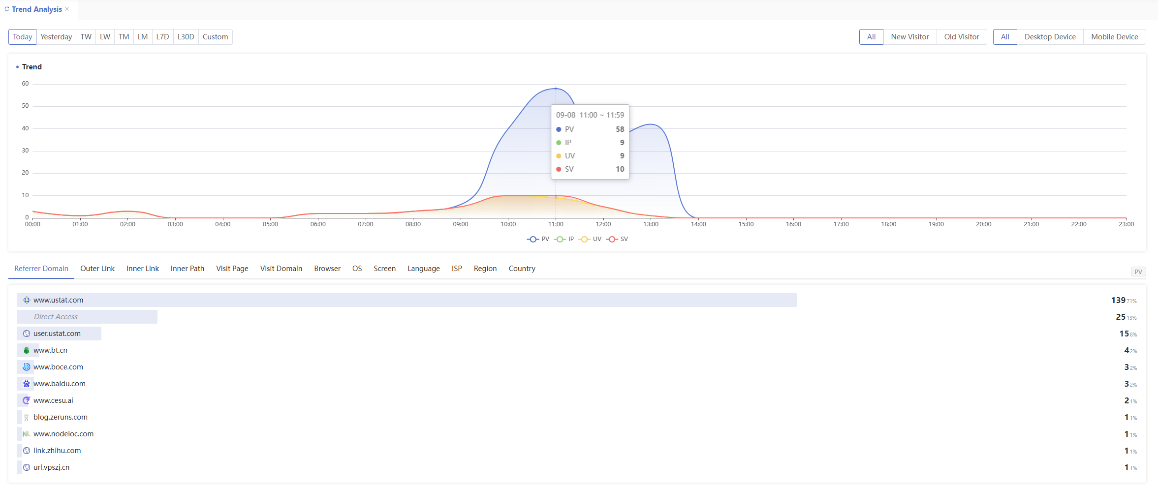 - Default view: Today's PV, UV, IP, and SV trends